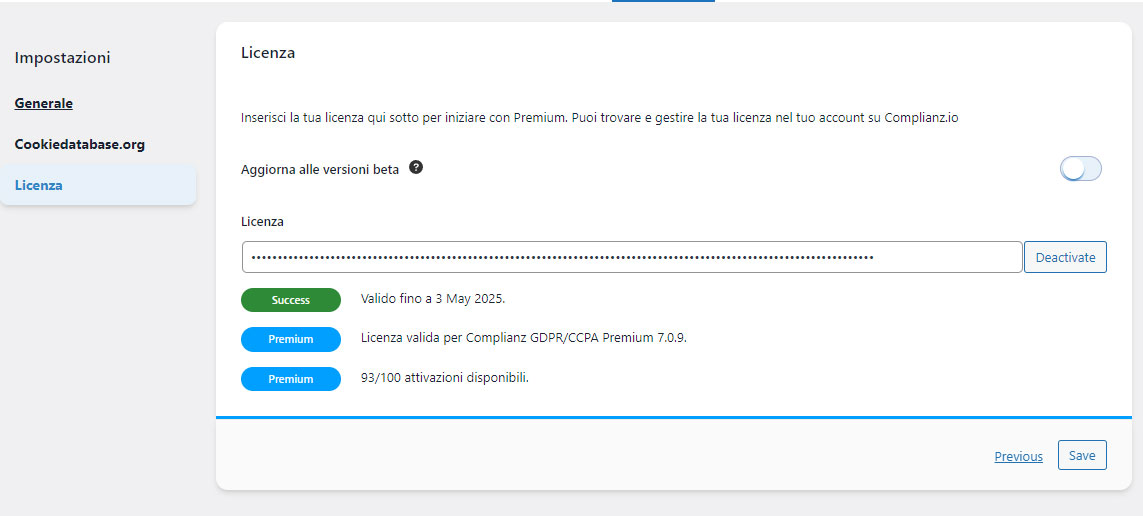Per installare la licenza basterà andare nelle impostazioni di Complianz e cliccare su Licenza: