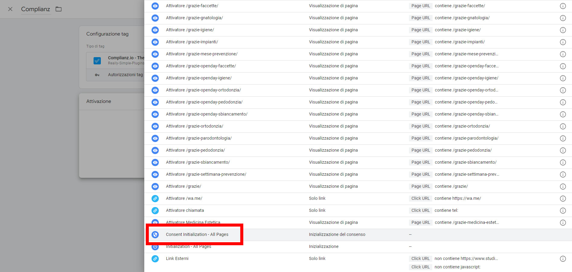 In attivazione, impostare come attivatore “Consent Initialization – All Pages” e infine salvare: