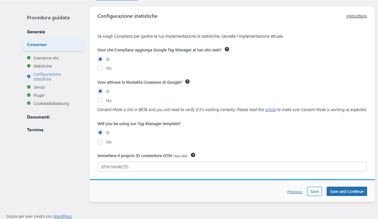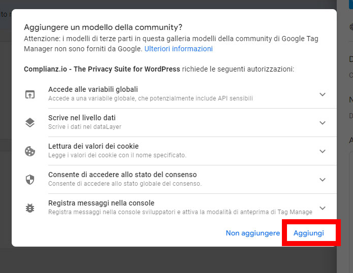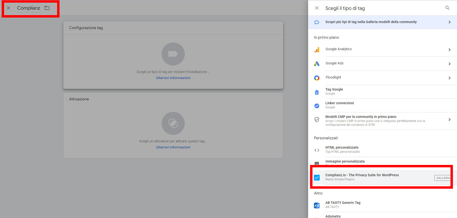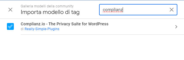 Dopo aver eseguito la procedura sul plugin Complianz, recarsi nella pagina di Google Tag Manager per installare il template già preconfigurato dai creatori di Complianz stesso.