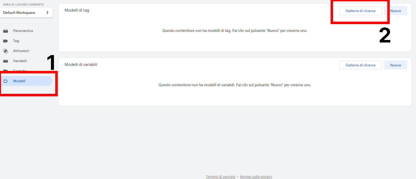 Una volta aperto GTM, sarà necessario recarsi nel menu laterale e cliccare su “Modelli” e successivamente cliccare su “Galleria di ricerca” in alto a destra del Box “Modelli di Tag”